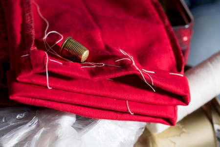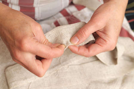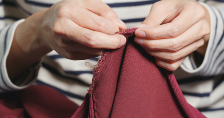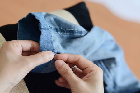 selective focus closeup of hands with needle sewing thread in fabric clothes.