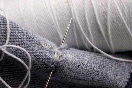 Accessories for repairing clothes on the background of cotton and jeans clothes