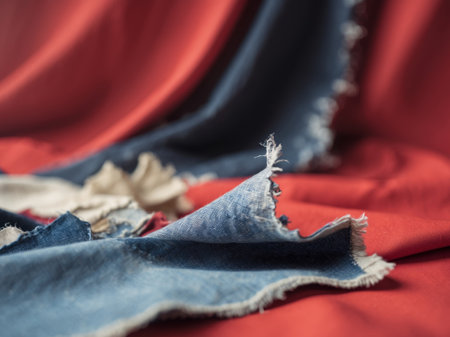 AI Generated. Throw a piece of scrap fabric whose types and colors are dropped onto the red cloth