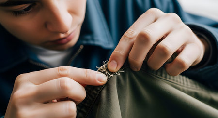 A detailed shot of hands using a needle and thread to mend a tear in green fabric. The image emphasizes sustainable fashion, DIY clothing repair, and the intricate skill of hand sewing to extend the life of garments.