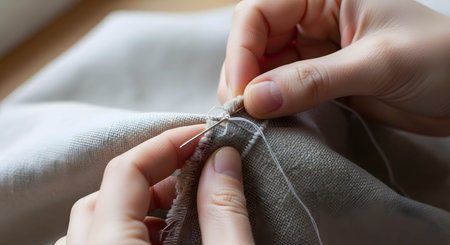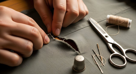 Close up of skilled hands sewing fabric with needle and thread, demonstrating careful garment repair techniques and manual craftsmanship.