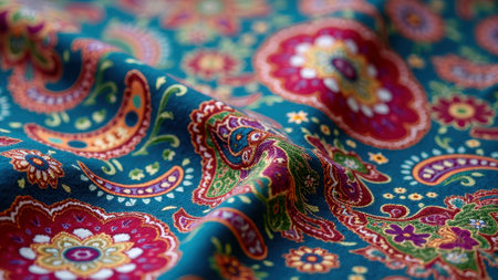Colorful paisley pattern on textile with intricate floral designs. That the image is generated using AI.