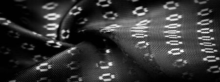 Monogrammed black and white silk fabric. Exquisite filigree fabric pattern. texture, background
