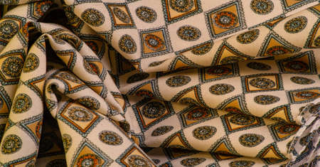 silk fabric in soft beige color with a print of rhombuses, squares and medals. Tell a story and make a statement with traditional design work that has charm and value. Texture background pattern