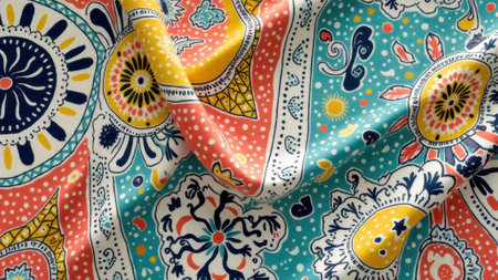 Intricate fabric pattern with vibrant colors displayed in a close-up shot