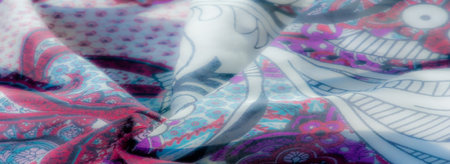 Blur of a vibrant fabric featuring a mix of white floral motifs, purple paisley designs, and intricate blue and red patterns, folded into dynamic textures.