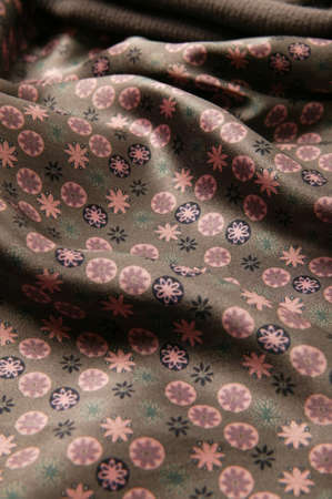 Silk brown with floral print and rhombuses. Soft fabric, glossy texture background, satin background, fabric luxury work, elegant pattern, colorful abstract, colorful velvet, macro shredded.