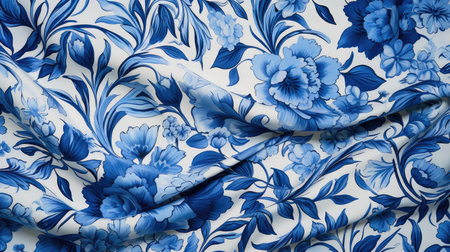Close-up of intricate blue fabric with white patterns showcasing textile artistry