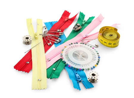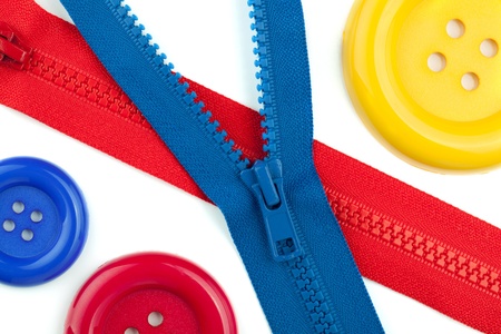 Three colored sewing buttons and two zippers closeup. Isolated on white