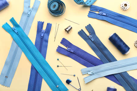 Pack lot of colorful plastic and metal zippers stripes with sliders pattern for handmade sewing tailoring on the blue denim background close up selective focus