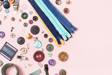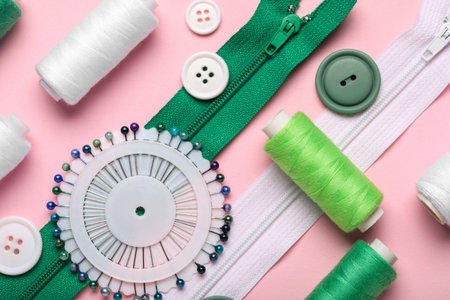Composition with thread spools, zippers and buttons on pink background, closeup