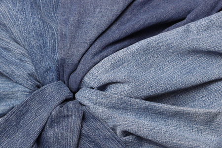 Closeup macro texture of blue jeans, clothing background with wrinkles and folds