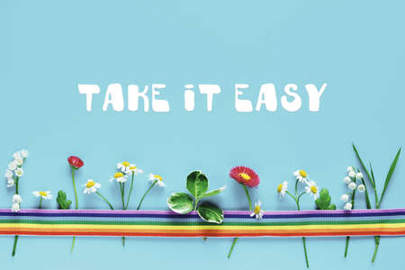 Text Take it Easy on blue paper. Rainbow ribbon, wild flowers. Flat lay, top view, motivation text. Simple minimal arrangement.
