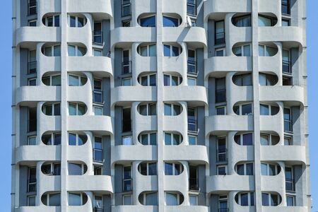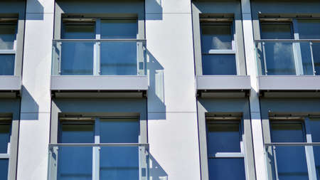 Condominium and apartment building with symmetrical modern architecture. Detail in modern residential flat apartment building exterior. Fragment of new luxury house and home complex.