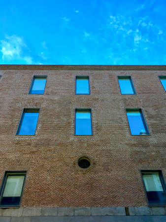 Brick and glass facade of a modern office building Modern architecture. The glass and brick.