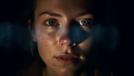 Curly-haired individual with expressive eyes and natural skin texture, capturing a subtle, intimate moment. The focus is on the face, with intricate details visible