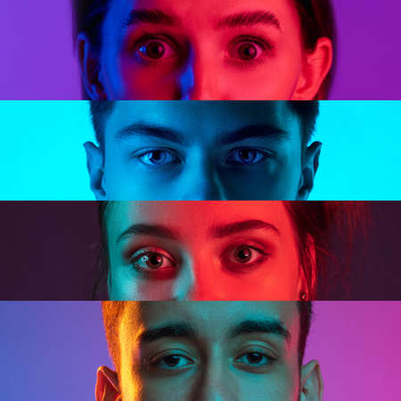 Collage of cropped male and female faces, eyes placed on the center isolated over multicolored neon backgrounds.