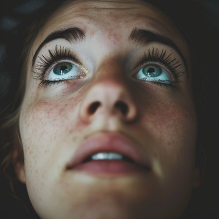A woman looking up with her eyes wide open, which could suggest surprise or attentiveness