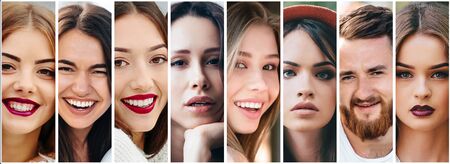 Collage with images of smiling people, young women and men posing isolated over multicolored backgrounds. Flyer