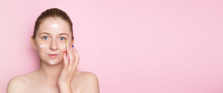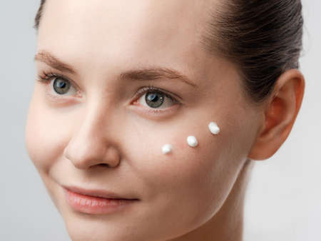Beauty close up portrait of a young woman applying a facial care product. She has a healthy skin. Cream smear.