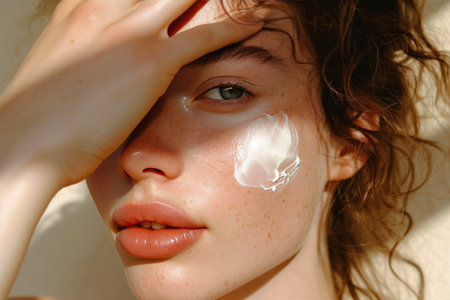 An intimate close-up showcasing a youthful face with natural freckles, featuring a skincare cream applied on the skin. The refreshing look emphasizes beauty and wellness.