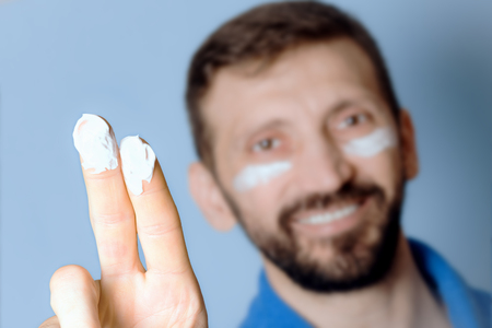 Man with a beard on a blue background, cosmetic face cream.