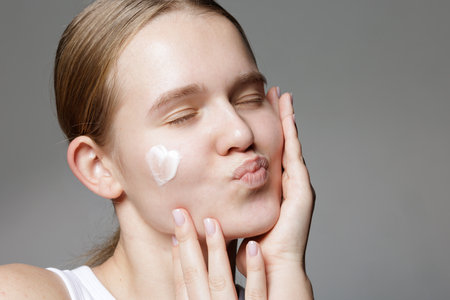 Young Woman Applying Moisturizing Cream on Cheek Close-up