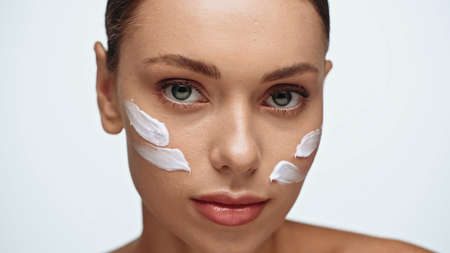 portrait of brunette young woman with cream on face looking at camera isolated on white