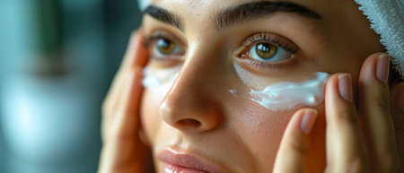 Close up portrait of young beautiful woman applying cosmetic cream on face.