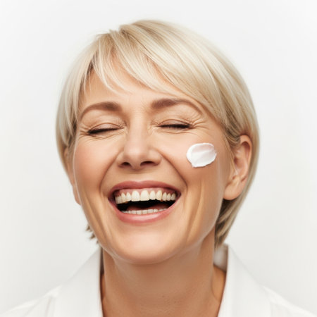 A smiling woman with short blonde hair is applying a skincare cream to her face. She appears to be enjoying the moment, with her eyes closed and a joyful expression on her face. The cream is visible on her cheek, indicating she is in the process of her skincare routine.