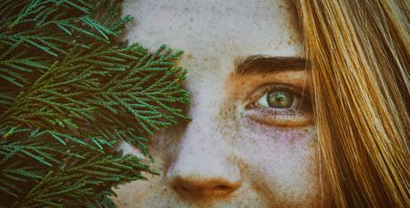 Portrait of a redhead woman with green pine leaves in the background in artistic conversion