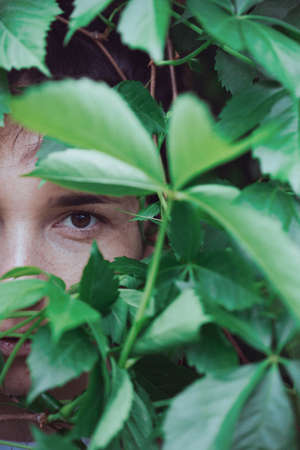 Portrait of a young man in green leaves. A nice guy is standing against a wall of green plants. A close-up of a white man in ivy thickets
