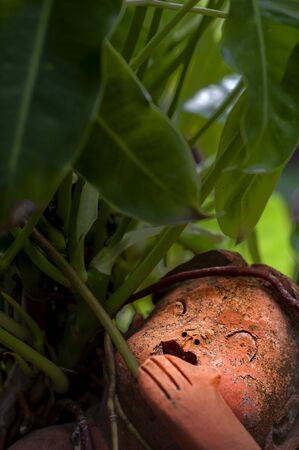 Old red clay doll facing the light under green leaves in curious concept for background.