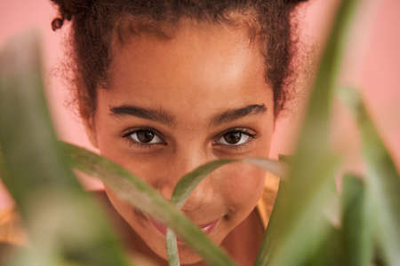 Multiracial girl peeping from bush of green plant and looking at camera with pleased smile