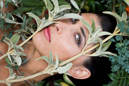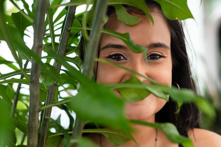 Face portrait of beautiful young woman with black hair looking at the camera through the leaves of a plant. Person traveling.