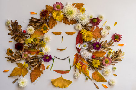 cat made from vivid autumnal leaves and flowers, isolated on white background