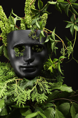 A man holds in front of him an indoor flower Ficus Benjamin Kinke, the plant covers his face, human depersonalization trend