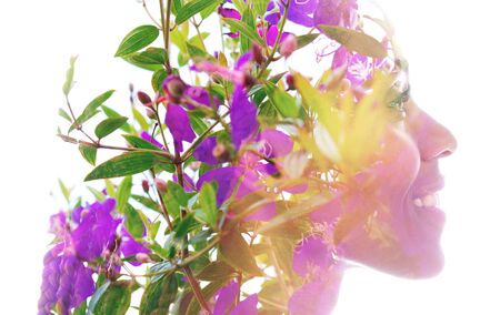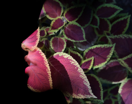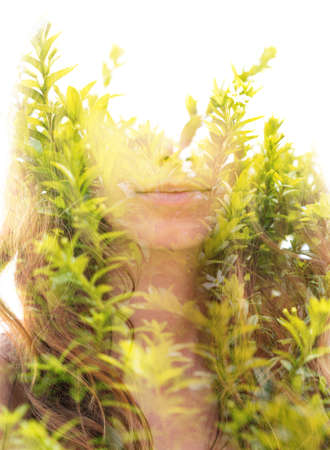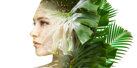 Double exposure female close up portrait with tropical plants in hair. Duotone