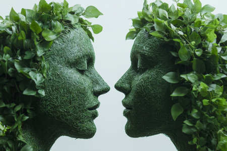 Green foliage sculptures of human heads representing growth and connection in minimalist style
