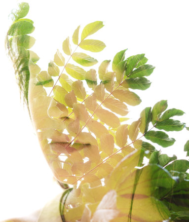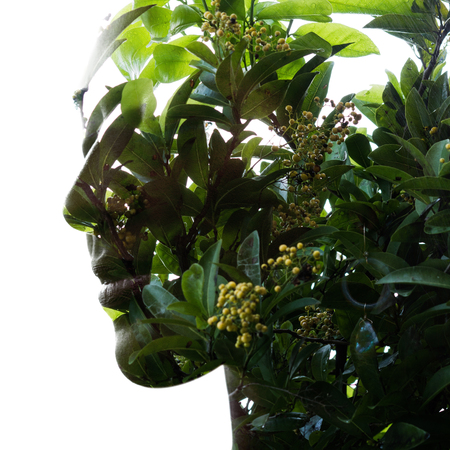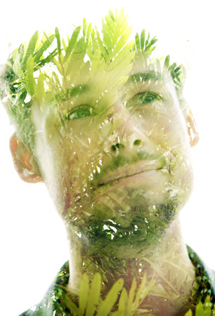 Double exposure close up portrait of an attractive man combined with plants, created with an ecological concept