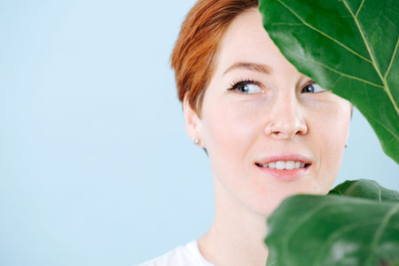 Portrait of a happy middle aged woman with short ginger hair behind big ficus leaves. She's wearing white T-shirt. Over blue background. looking to side.