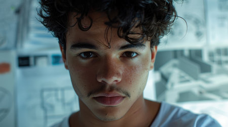 A close-up portrait of a young Brazilian male architect