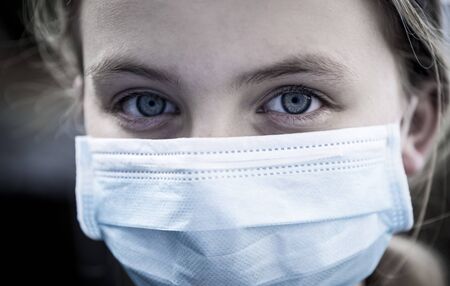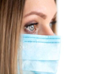 Young woman wearing a protective surgical face mask during the Coronavirus disease (COVID-19) outbreak epidemic. Close up portrait with a multiple use white protection mask on the face.
