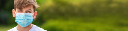 Panorama boy teenager teen male child wearing a face mask outside during the Coronavirus COVID-19 virus pandemic panoramic web banner header