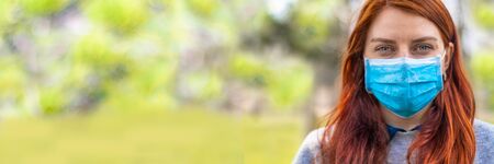 Young woman wearing disposable blue virus face mouth nose mask, closeup portrait - wide banner with space for text right side. Coronavirus covid-19 outbreak prevention concept