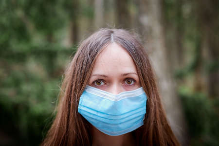 Beautiful young brunette woman with long hair wearing medical mask in a pines and firs forest on a summer day during the covid-19 pandemic