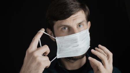 Attractive bearded man is putting on surgical mask on his face for corona virus covid-19 prevention. Infection protection, quarantine and epidemic concept. Slow motion close up front view 4k video.