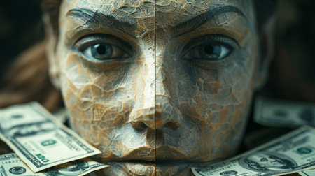 Abstract image of a textured face surrounded by dollar bills. This artwork symbolizes themes of greed, deception, and the pursuit of wealth, using a creative and thought-provoking design.