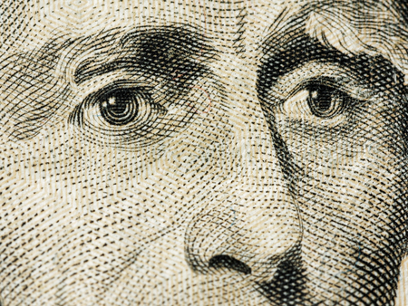 close-up of a detail of American dollars with a portrait of the President, face value of twenty dollars, genuine money
