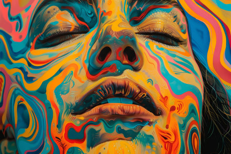 This artwork features a woman's face intricately painted with vivid, swirling colors, capturing a blend of emotion and artistic creativity in vivid detail.
